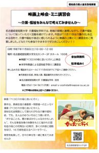 介護福祉学科では、地域の皆様に介護や福祉をより身近に感じていただくための活動を行っています。このたび「11月11日 介護の日」に合わせ、映画上映会とミニ講習会を開催します。