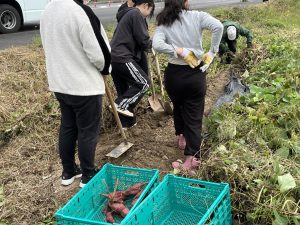 収穫を終えると、井上さんから「干し芋を作ってみたら?」との提案が。 するとすぐに「スイートポテトがいい!」と声が上がり、大盛り上がり。 乾燥させた後にスイートポテト作りができるよう、材料や手順を確認してくることを宿題に、この日の授業を終えました。 次回は、「稲刈り」に挑戦です! 井上さんと担当教員が植えたもち米を収穫します。(田植えの様子はこちら)