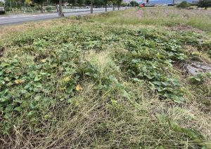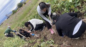 今回も、「さつまいも堀り」に挑戦です! (前回(第3回)の様子はこちら) まだまだコツがつかめず、蔓が生い茂るなか悪戦苦闘する学生たち。はじめは井上さん(イノウエファーム)の手を借りながらも、次第に自分たちで協力し合い、土の中のさつまいもを丁寧に掘り進めていきました。