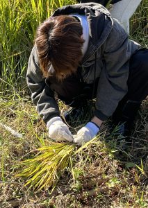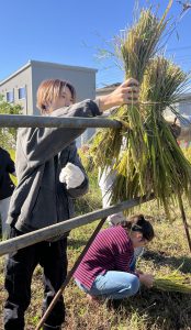 初めて挑戦する学生もいれば、過去に経験がある学生も。みんなで協力しながら稲を刈り、5束ほどを目安にしっかりと紐で縛って干していきます。