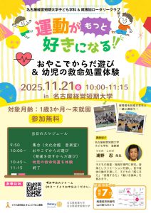 11月21日(金)子ども学科2年生の授業「保育内容演習(健康)の指導法」で、尾張旭ロータリークラブさんと共同で『運動がもっと好きになる!!ーおやこでからだ遊び&救命処置体験ー』を開催しました。