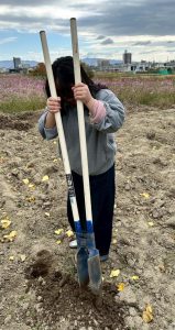 今回は、案山子(かかし)づくりの後半戦です! 前回(第7回)の作業を思い出しながら、学生たちは黙々と手を動かしていきます。井上さん(イノウエファーム) や教員にアドバイスを受けつつ、藁で形を整え、顔を描き、立てる場所の土を掘り、脚をしっかりと固定して・・・ついに完成!