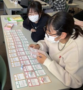 子ども学科の2年生が、遊びながら福祉の知識を学べるカードゲーム「ふくろく~福祉人生すごろく~」に挑戦しました。